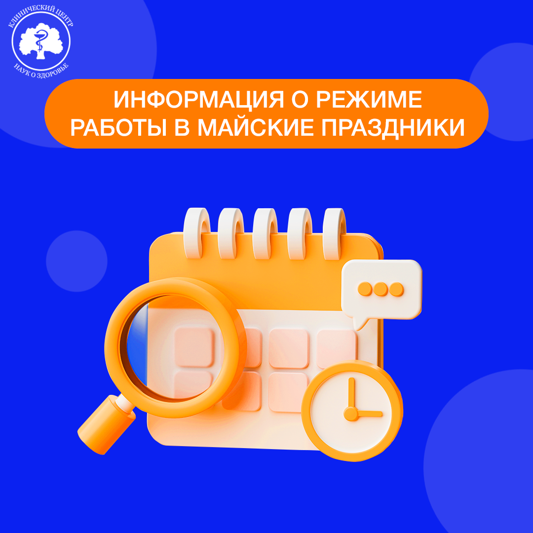 Информируем вас о том, что в праздничные дни с 1, 2, 3, 4, 8, 9, 10, 11 мая специалисты Клинического центра не будут вести амбулаторные приемы.